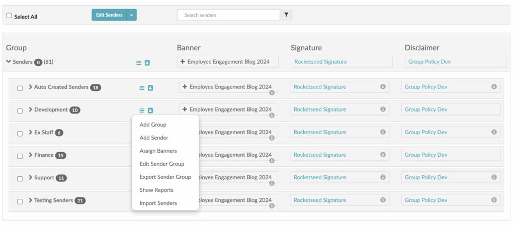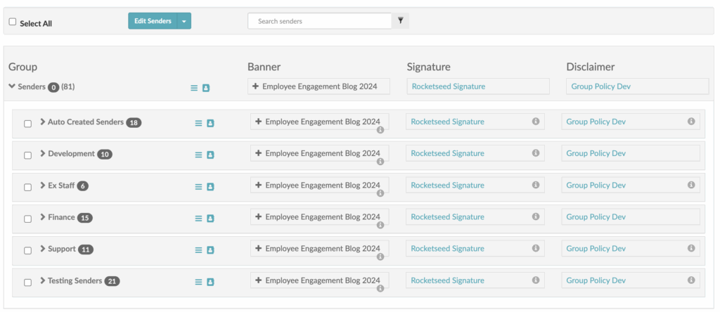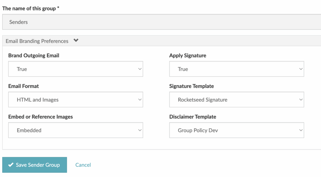Signatures and Disclaimers are can be assigned to the account as a whole, to specific groups within the sender hierarchy or to an individual and are assigned using the same mechanism. Assigning to groups of senders is the most common practice and will be covered in the steps below.