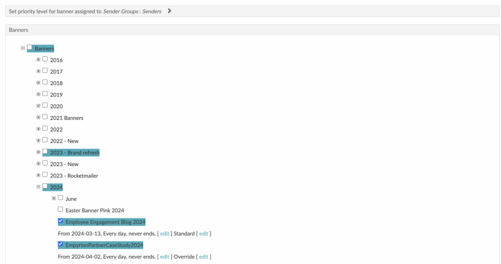 The list of all the available banners and the groups they are in will be shown in a hierarchy. Expand the hierarchy using the + until you see the banner or banners you want to assign as shown below.