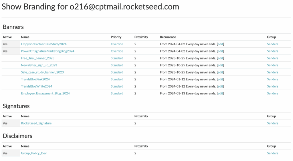 You can send an email to branding-test@rocketseed.com. Your will get a mail back from the system with a fully branded email as though you’d sent a test mail to yourself.