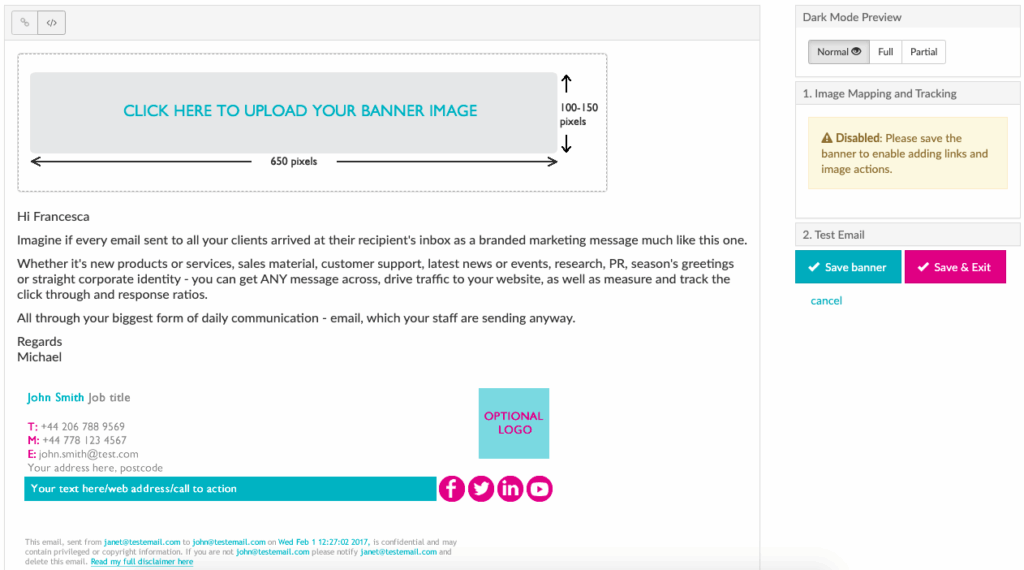 Banners with branding information are added to emails leaving the organisation. These banners contain links that allow the email recipient to engage with the organisation’s marketing messages and allows Rocketseed to record that click information and act accordingly.