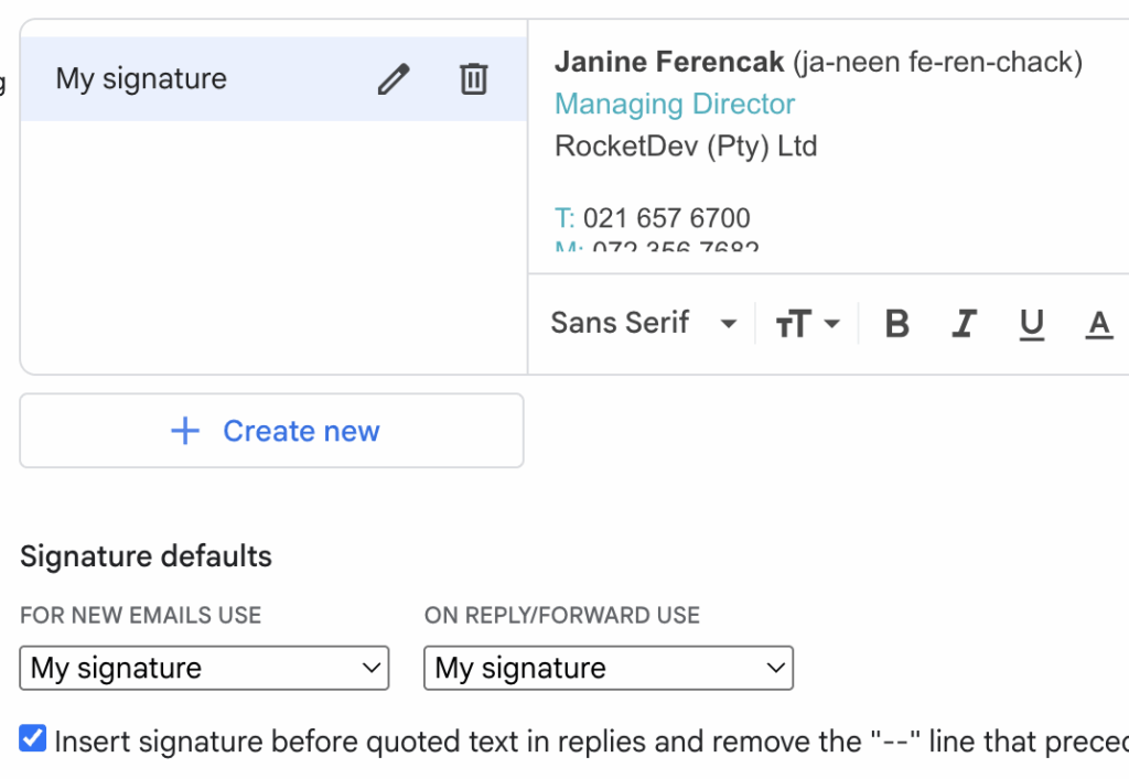 As explained, the SoC Add-in for Google Workspace users needs to be installed by the Google Workspace Mail Administrator. Once this update has been pushed to all the users, they will see their Rocketseed signature design in the Signature section of their Gmail account as shown below.
