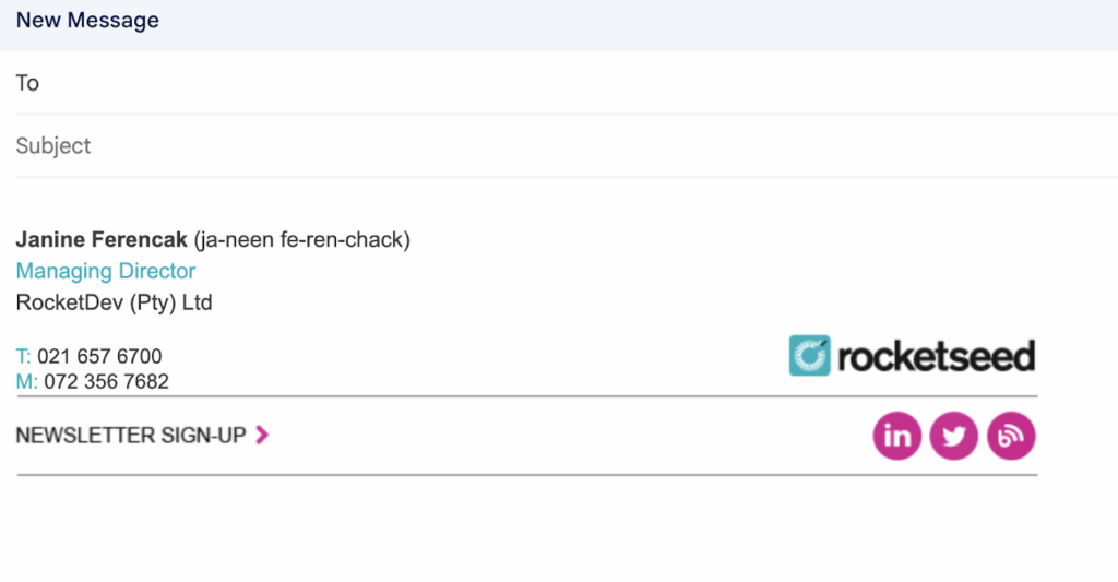 The Rocketseed email signature on compose pulls the signature design and the personal data held in the Rocketseed database into the compose email window at the time of your email composition. This Signature on Compose functionality is available in your Google Web Access email client.